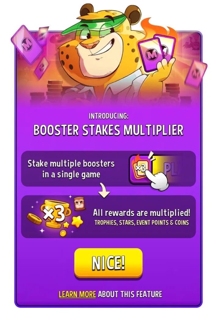 The booster stakes multiplier is a “high-risk/high-reward” feature that lets you stake multiple boosters on a single match to multiply your rewards when you win.