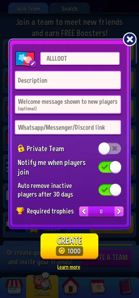 Step 3: tap on the “Create” button and pay the fee (1000 coins).
