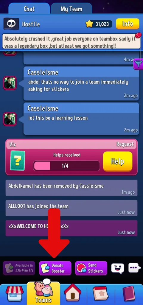 First, open the team chat and tap on “Donate Booster” to open the boosters screen.