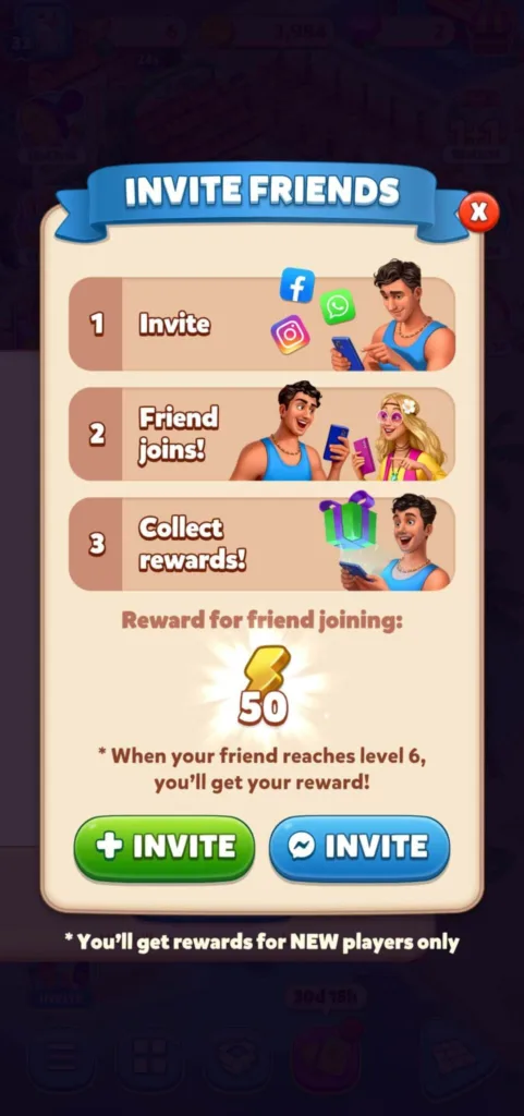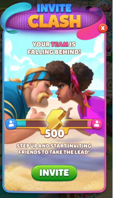 Use your invite link in the game to invite people who don’t play Travel Town yet. And when a new friend joins the game through your invite, your team gets 1 point. So while the event is active, both teams have to invite as many new friends as possible.