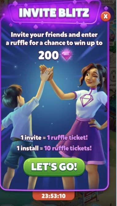 When Invite Blitz is active, you send invites to your friends from the game, and for every friend you invite, you’ll get one raffle ticket (even before they install the game). But if your friend uses your invite link and installs the game, you get 10 more tickets for that friend.